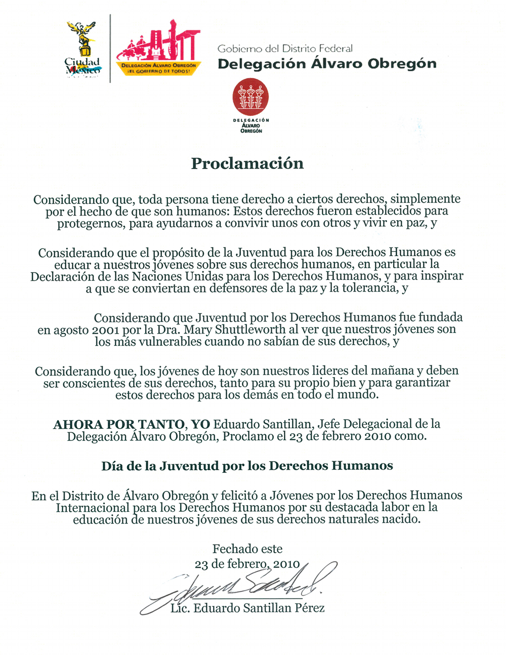 2010 – México, Proclamación del Día de Jóvenes por los Derechos Humanos