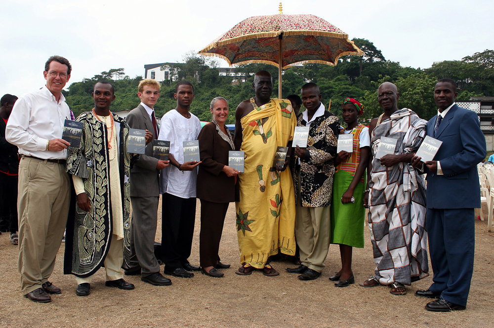 Chefer från internationella Ungdomar för mänskliga rättigheter tillsammans med kungen av Cape Coast och myndighetspersoner under den globala informationsturnén 2005.