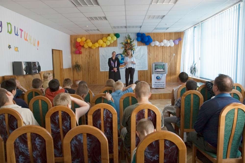 Under nästa år kommer omkring 1 500 förlorade eller förrymda barn i åldrarna 3 till 18 år att tillbringa upp till tre månader vid Kievs barnhem för föräldralösa ungdomar och tonåringar. Det var en grupp av dessa unga människor som Youth for Human Rights International (YHRI) riktade sig till om betydelsen av mänskliga rättigheter.